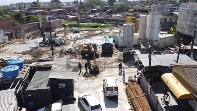 As obras de uma estação elevatória, um canal e uma comporta no final da Av.…